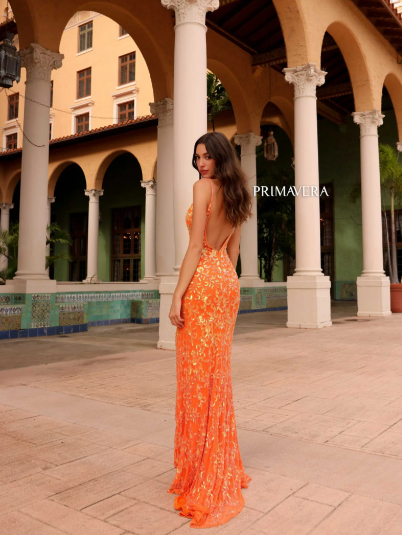 V Neck Patterned Beaded Gown w/ Slit