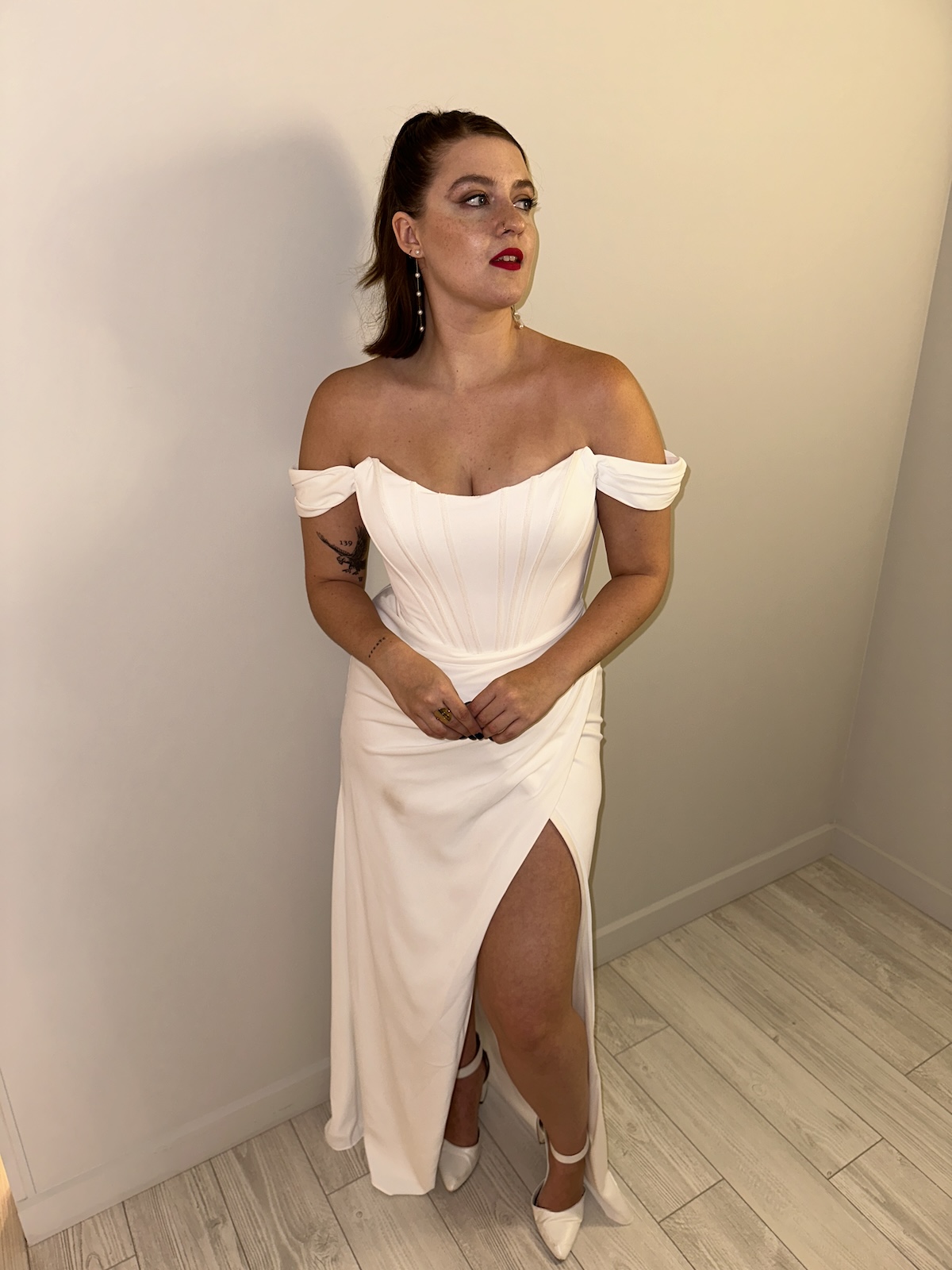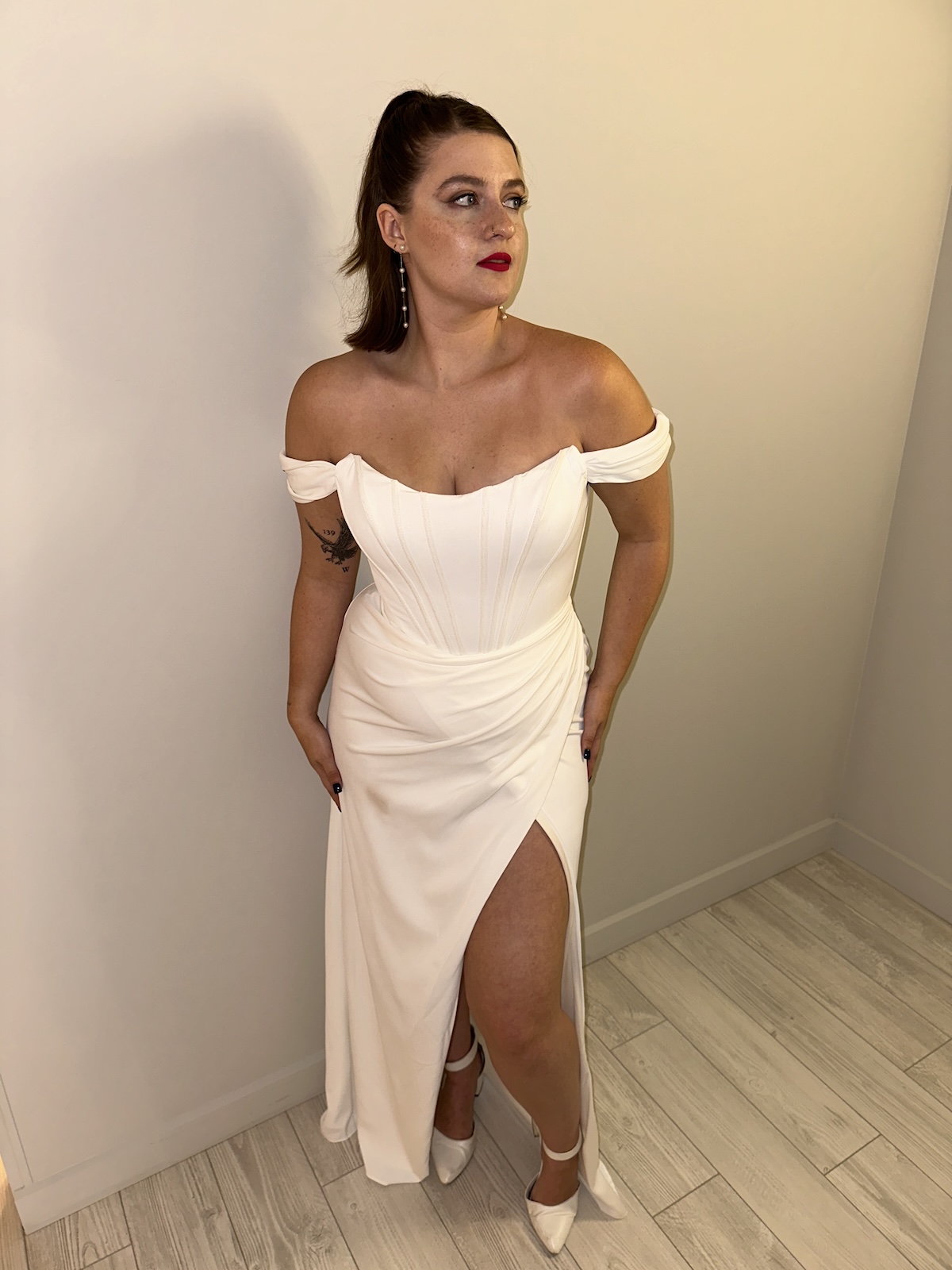 Strapless Satin Bridal Gown with leg slit, or your perfect reception look.