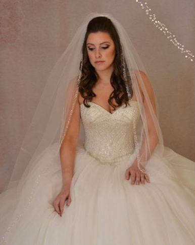 Ivory cathedral veil edged w/ beads, pearls, sequins, 110″